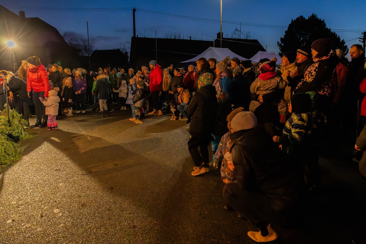 Po té už nastal velký úkol pro všechny děti, kteří chodí do místní základní školy. Pod vedením paní učitelky Báry Odehnalové zazpívaly píseň o jednom hlavním symbolu adventu a Vánoc. Ostatní tak mohli pozorovat, jestli se během jejich písně „Pozdraveno budiž světlo“ rozsvítí obecní adventní věnec. Vše se podařilo a na adventním věnci se rozsvítila první svíčka. Dokonce i na druhé straně od podia se nasvítily sochy Svaté rodiny, jenž obec pořídila, aby v době adventní, ale hlavně v době vánoční zdobily okolí naší kaple. Kéž nám všem, při cestě do práce z práce, náš obecní adventní věnec připomíná naději, že na žádný problém nejsme sami.