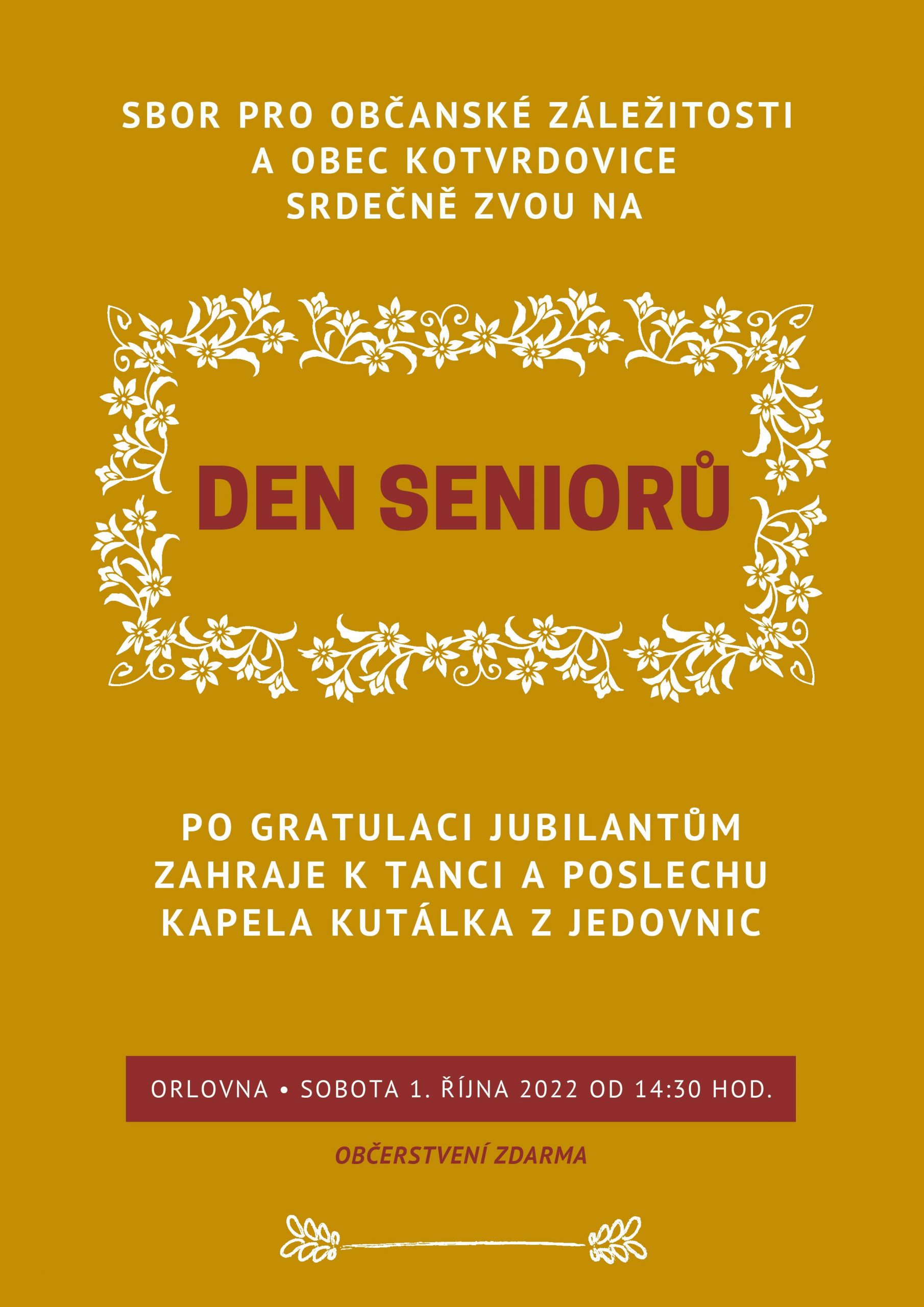 Sbor pro občanské záležitosti a Obec Kotvrdovice srdečně zvou na oslavu Dne seniorů v sobotu 1. října ve 14:30 v sálu místní Orlovny. Po gratulaci jubilantům zahraje k tanci a poslechu kapela Kutálka z Jedovnic. Občerstvení zdarma.