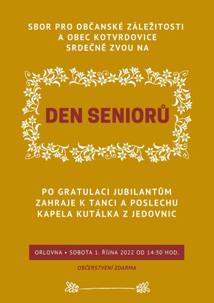 pro občanské záležitosti a Obec Kotvrdovice srdečně zvou na oslavu Dne seniorů v sobotu 1. října ve 14:30 v sálu místní Orlovny. Po gratulaci jubilantům zahraje k tanci a poslechu kapela Kutálka z Jedovnic. Občerstvení zdarma.