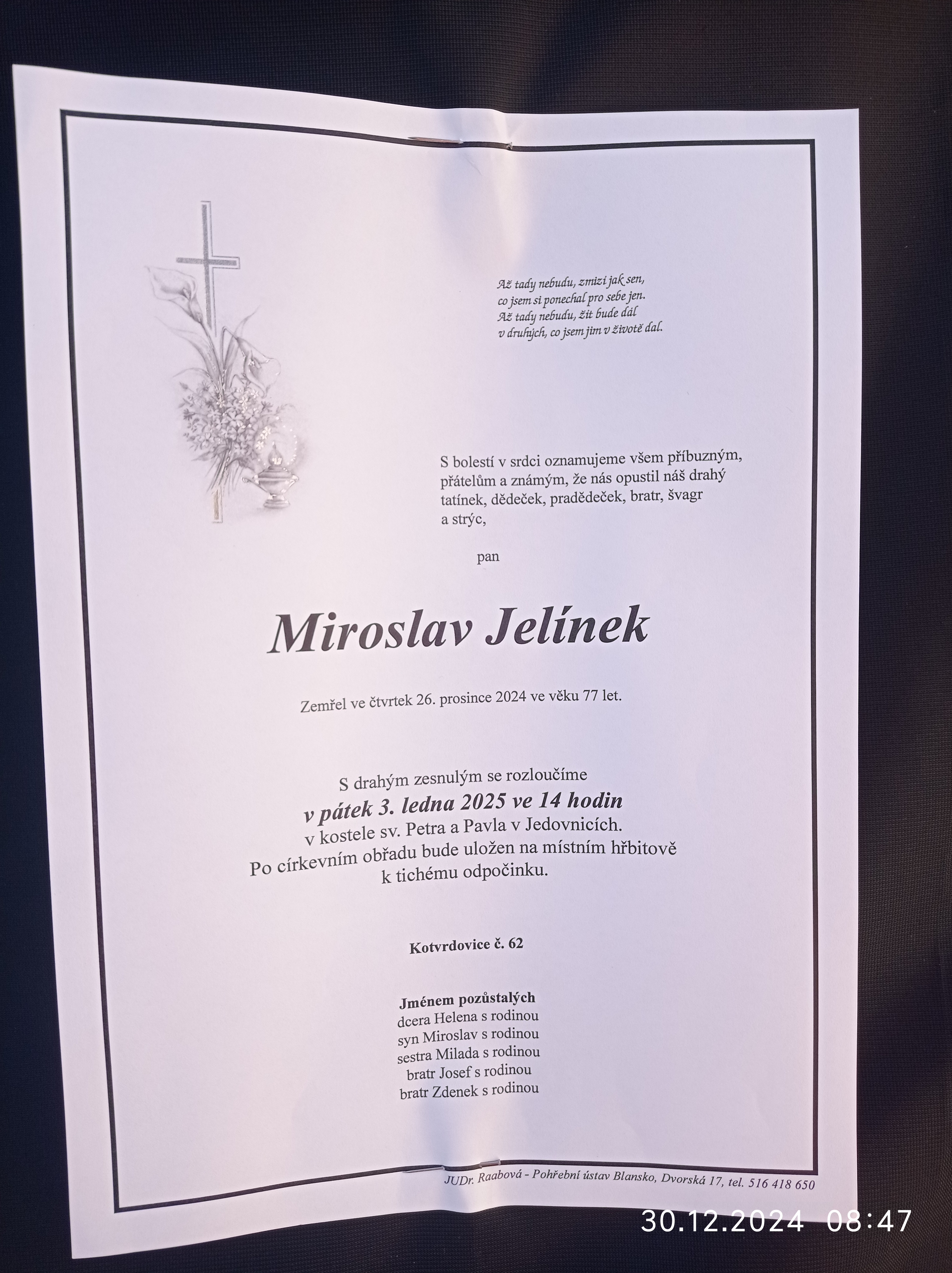 Úmrtí - pan Miroslav Jelínek, Kotvrdovice 62 - zemřel 26. prosince 2024 ve věku 77 let. Poslední rozloučení se koná v pátek 3. ledna 2025 ve 14 hodin v kostele sv. Petra a Pavla v Jedovnicích.