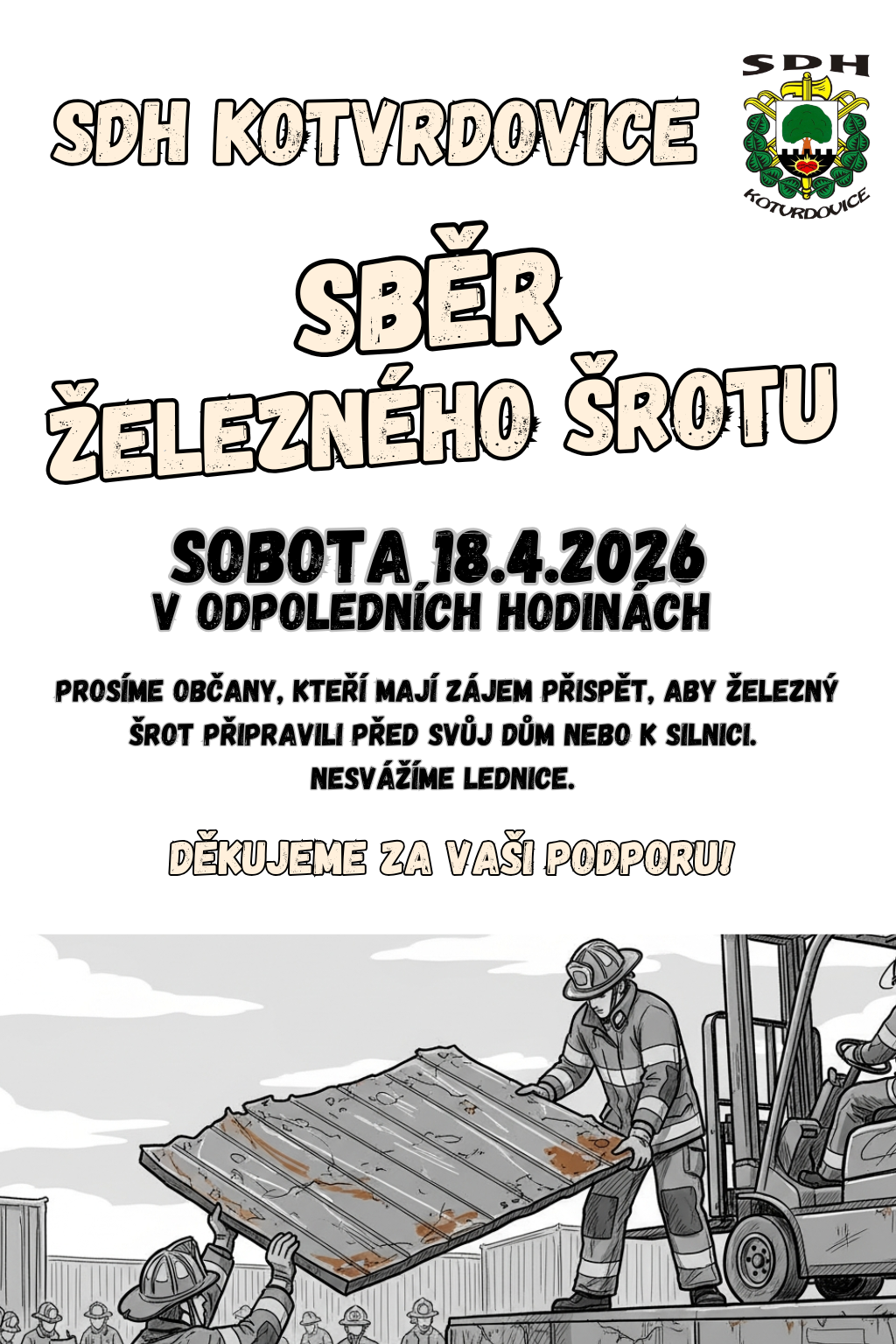 SDH Kotvrdovice uskuteční v sobotu 18. dubna v odpoledních hodinách sběr železného šrotu. Prosíme občany, kteří mají zájem přispět, aby šrot připravili před svůj dům nebo k silnici. Nebudou se svážet lednice.