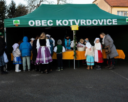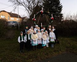 Po té už nastal velký úkol pro všechny děti, kteří chodí do místní základní školy. Pod vedením paní učitelky Báry Odehnalové zazpívaly píseň o jednom hlavním symbolu adventu a Vánoc. Ostatní tak mohli pozorovat, jestli se během jejich písně „Pozdraveno budiž světlo“ rozsvítí obecní adventní věnec. Vše se podařilo a na adventním věnci se rozsvítila první svíčka. Dokonce i na druhé straně od podia se nasvítily sochy Svaté rodiny, jenž obec pořídila, aby v době adventní, ale hlavně v době vánoční zdobily okolí naší kaple. Kéž nám všem, při cestě do práce z práce, náš obecní adventní věnec připomíná naději, že na žádný problém nejsme sami.